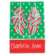 Este saco de presentes bonitinho apresenta arcos vermelhos e verdes de Natal num fundo de bolinhas verdes e brancas correspondentes. Personalize a faixa vermelha brilhante com sua escolha de nome e texto especial de feriado em cada lado.