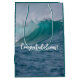 Saco de presente de papel com design de onda oceânica. Adicione "Parabéns" ou "Parabéns" ou qualquer texto à frente. A cor é azul-oceano com texto branco e vem em três tamanhos. O texto longo não será ajustado no saco de vinho/garrafa. Perfeito para homens ou mulheres e para a maioria das vezes.