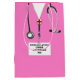Design de bolsa de presente criativo com esfregões cor-de-rosa de hospital para formando de graduação em escolas médicas. Para personalizar editar texto para adicionar o nome do médico.