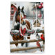 Ilustração de aquarela de uma cena numa fazenda rústica com um cavalo e cardeais pintados ou pintados marrom e branco e uma cerca de madeira decorada em pínus, bagas e garland em um dia de inverno de Natal.