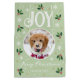 Espalhe um pouco de alegria nesta temporada de festas com um saco de presentes personalizado! Esta modelo de Natal divertida mostra duas de suas fotos favoritas, e é personalizada com o nome do destinatário, seu nome de família ou o ano de feriado. Um na moda, design moderno, com quadros em forma de círculo, colocados sobre um fundo festivo de folhas, bagas, flocos de neve e estrelas, com tipografia decorativa, e uma letra de roteiro. Perfeito para fotos de crianças, família, amigos e animais de estimação. Este saco de presentes festivos está disponível com um acabamento mate ou brilhante. Cores impressas: verde pastel, vermelho, branco e ouro.