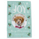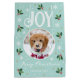 Espalhe um pouco de alegria nesta temporada de festas com um saco de presentes personalizado! Esta modelo de Natal divertida mostra duas de suas fotos favoritas, e é personalizada com o nome do destinatário, seu nome de família ou o ano de feriado. Um na moda, design moderno, com quadros em forma de círculo, colocados sobre um fundo festivo de folhas, bagas, flocos de neve e estrelas, com tipografia decorativa, e uma letra de roteiro. Perfeito para fotos de crianças, família, amigos e animais de estimação. Este saco de presentes festivos está disponível com um acabamento mate ou brilhante. Cores impressas: menta azul-esverdeada pastel, vermelha, verde, branca e ouro.