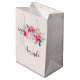Saco de presentes com uma imagem de aquarela. Um belo arranjo floral com cor rosa brilhante e rosa pastel aninhado entre folhas verdes e galhos.