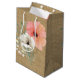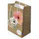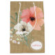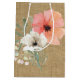Uma bolsa de presente de tamanho médio e personalizada, feita em um olhar de burlap. Flores pintadas por aquarelas decoram a frente e a parte de trás do saco-presente. Uma área decorativa branca de texto oval, na parte inferior da frente da bolsa, tem texto personalizado colorido de coral que você pode personalizar. Está disponível papel de tecidos correspondente.