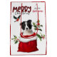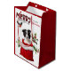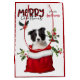 A imagem em frente e verso deste saco de presentes de Natal é uma imagem de um filhote de Collie preto e branco bonitinho a espreitar de um saco de presentes de Natal. Atrás dele está um sorvedouro de bagas sagradas e vermelhas. Um pássaro toucinho vermelho e preto está prestes a pousar. O texto da xadrez de búfalos vermelho e preto estilizado diz MERRY CHRISTMAS". Sua própria assinatura está em dois campos para você personalizar. Certifique-se de ver os produtos correspondentes, incluindo ornamentos, em nossa loja.
