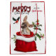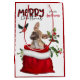 A imagem em frente e verso deste saco de presentes de Natal é uma imagem de um filhote de Chihuahua marrom adorável espreitando de um saco de presentes de Natal. Atrás dele está um sorvedouro de bagas sagradas e vermelhas. Um pássaro toucinho vermelho e preto está prestes a pousar. O texto da xadrez de búfalos vermelho e preto estilizado diz MERRY CHRISTMAS". Sua própria assinatura está em dois campos para você personalizar. Certifique-se de ver os produtos correspondentes, incluindo ornamentos, em nossa loja.