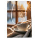 Xícara de café a vapor num cobertor quente por uma janela de inverno com sol.