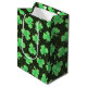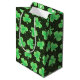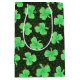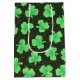 Saco médio brilhante com uma imagem de shamrocks verdes de borda irregular, bolinhas verdes e bolas de ouro a preto. Ver o grande saco de presentes, confetti, caixa de favor, etiqueta de favor, etiqueta, etiqueta redonda e papel de embalagem. Veja a Rua inteira. A coleção do Patrick Day Gift Bag nos TOUCHES ESPECIAIS| Seção Favoritos para festas.