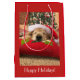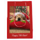 Feliz Natal! Mostre seu espírito do feriado com este saco bonito do presente! Características de design uma fotografia de um cão do golden retriever que esteja adormecido em um travesseiro sob uma árvore e vestir um chapéu vermelho do papai noel. O texto customizável lê, "boas festas!"