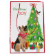 Em cada lado desta bolsa de presentes de Férias, um Cachorro German shepherd veste um cachecol vermelho enquanto assiste um pássaro tremendo na árvore de Natal. Ao redor do cão, pacotes de presentes envoltos com conteúdo intenso estão espalhados. O texto vermelho e verde diz "JOY Natal".