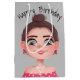 Garota bonita de desenho animado com grandes olhos em um fundo de cinza e texto de aniversário feliz. O texto é editável ou pode ser excluído. A cor de fundo pode ser alterada.