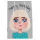 Garota bonita com cabelos loiros e grandes olhos em um fundo de cinza e texto feliz de aniversário. O texto é editável ou pode ser excluído. A cor de fundo pode ser alterada.