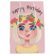 Menina bonita de desenho animado com cabelos loiros e flores em um fundo cor-de-rosa e texto feliz de aniversário. O texto é editável ou pode ser excluído. A cor de fundo pode ser alterada.