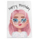 Menina bonita de desenho animado, com cabelo rosa e óculos de olho-de-gato, sobre fundo branco e texto de aniversário feliz. O texto é editável ou pode ser excluído. A cor de fundo pode ser alterada.