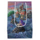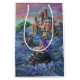 Se você ama as sereias, então esta pintura é para você. O Castelo de Sereia pintado por Traci Van Wagoner apresenta uma sereia com cabelo roxo na frente e uma sereia com cabelo verde se soltando em ilhas rock enquanto outra sereia com natações de cabelo cor-de-rosa no oceano diante de um castelo com um céu roxo, laranja e amarelo por trás. Esta bela e caprichosa arte da fantasia faz um presente de excelente e uma decoração espantosa para o seu escritório ou casa.