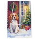 Brighten the season with this charming Christmas card featuring a Cavalier King Charles Spaniel on a festive snowy porch. A glowing lantern, holiday wreath, and decorated tree create a warm and cozy winter mood illustrated in soft watercolor style. The blank interior offers plenty of space for personal greetings, making it perfect for dog lovers, holiday correspondence, and thoughtful gifting.