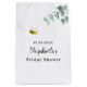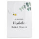 Um fundo branco elegante. Decorado com verdejante eucalipto pintado à mão, folhagem e uma abelha fofa e feliz sorrindo. Personalize e adicione o nome da noiva à abelha e uma data. O nome é escrito com um estilo de letra moderna e manuscrita.