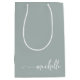Saco de presente personalizado com nome em monograma elegante moderno verde sage delicado glam script assinatura. Este design apresenta seu primeiro nome em uma linda tipografia de assinatura com estilo de letra manuscrita com cauda swash (ou caligrafia) sobre um fundo verde sage ou verde poeirento. Estes são fáceis de personalizar. Esta bolsa de presente feminina é ótima para presente de casa nova, também para aniversário, chá de noiva, casamento, festa de aniversário de 16 anos, chá de bebê, dia das mães, presente de formatura e é para a garota que ama coisas de elegância única.