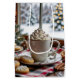Belo saco de presente de Natal sazonal com uma ilustração de chocolate quente, biscoitos de açúcar, fatias de laranja secas, bastões de canela e uma árvore de Natal fora de uma janela de inverno.