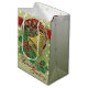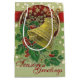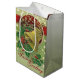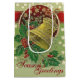 Saco médio brilhante de presente com uma bela imagem vintage de 1912, na frente e atrás, de uma campainha de ouro amarrada com um ouro, sagrada verde com frutas vermelhas, e estrelas de ouro reluzente que parecem derramar de um círculo vermelho profundo e aparado. "Saudações da Estação" é impresso abaixo em vermelho. Consulte cartão de saudação, confetti, caixa de favoritos, etiqueta de favor, adesivo quadrado, adesivo de vinil com corte personalizado e papel de embalagem. Veja toda a coleção Holiday Gift Bag nos TOUCHES ESPECIAIS | Seção Favoritos para festas.