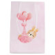 Um saco de presentes com uma ilustração adorável de um pequeno coelho bebê marrom vestindo uma pequena coroa ouro. Transportado por balões em um cobertor cor-de-rosa.