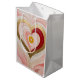 This is an abstract, symmetrical painting centered on a large heart motif that radiates outwards in concentric layers. The color palette is dominated by soft shades of pink and white, creating a gentle, flowing background texture that suggests organic movement or energy fields. The heart is defined by alternating bands of color, prominently featuring luminous gold leaf and a deep, solid red accent on the upper right side. The core of the heart is marked by a bright, yellow circle surrounded by smaller concentric rings. Delicate gold lines outline the major bands, emphasizing the structure and contributing to a sense of luxury and spiritual geometry. The overall composition is harmonious and uplifting.