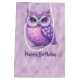 Aqui você encontrará uma variedade de corujas coloridas com brilho de fundo brilhante de uma cor contrastante. Feliz aniversário em uma sombra escura de roxo está na parte de trás e na frente, mas isso pode ser mudado para o que você quer.