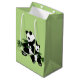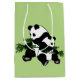 Panda mama senta-se comendo bambu enquanto o bebê faz como o bebê panda vê