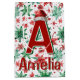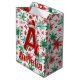 Crianças personalizaram a bolsa de presente de Natal, flocos de neve vermelhos e verdes, sua primeira inicial com chapéu de santa e seu nome. Podem ser necessários alguns ajustes com algumas letras. Use a ferramenta design para mover o chapéu.