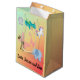 Você está convidado para um chá de fraldas? Considere este charmoso design com criaturas e. No topo, uma faixa de turquesa mostra o "bebê". Olhando através da faixa estão uma coruja verde, uma cabeça de urso marrom e um leão marrom. Ao lado da faixa estão um hipopótamo azul roxo e um unicórnio branco com um homem e cauda roxo e azul. Um fluxo de borboletas roxas desbotadas voa em direção ao unicórnio. Na borda das borboletas há uma girafa e um elefante. A frente da bolsa apresenta o nome da futura mãe, enquanto a parte de trás lhe permite adicionar seu nome como doador de presentes.