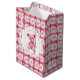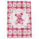 Pink and white crocheted teddy bear girl's baby shower gift bag. An adorable pink teddy bear crocheted with pink and white yarn adds the sweetest touch.