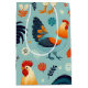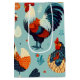 Galinhas e Galos - Design de padrões sem costura. Animais de exploração; Galo e Design gráfico de galinhas. Branco, azul, vermelho e laranja.