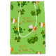Belo padrão do Dia de São Patrício, com coração, shamrock e o desejo de Feliz Dia de São Patrício nas cores da bandeira irlandesa, bem como coração verde e moeda de ouro verde brilhante com molduras de ouro verde.