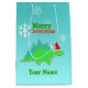 Saco verde do feriado do presente do nome do dinossauro dos desenhos animados do Feliz Natal. Um Stegosaurus verde adorável de Dino dos desenhos animados com um chapéu vermelho do papai noel com neve lasca-se caindo do saco do presente do céu com seus nome e texto "Feliz Natal". Preencha seu nome para fazer seu saco de Dino do Natal pessoal!