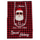 Esta entrega especial e divertida do Sr. Papai Noel Gift Bag de Natal apresenta um design personalizado com um padrão de verificação de xadrez de búfalos vermelho e preto e um nome de membro da família de scripts personalizados de e para branco e vermelho.