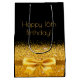 Saco de presentes elegante, clássico, glamouroso e feminino para uma garota de 16 anos. Uma fita colorida dourada e arco com brilho e brilho de ouro falsa, um pouco de brilho e luxo para um aniversário. Fundo preto. Texto do ouro: Feliz 16º aniversário!