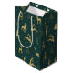 As renas dançantes e dançantes entre as árvores de Natal estilizadas em um falso efeito de folha de ouro são aspergidas com flocos de neve e estrelas nesta elegante design de saco de presente. Escolha qualquer cor de fundo para substituir o verde profundo que escolhemos como exemplo, ou deixe como está.