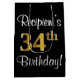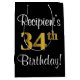 Este na moda, elegante e sofisticado design de saco-presente com tema de aniversário apresenta o número normal "34", com uma aparência falsa/imitação de ouro, além de uma mensagem de saudação de aniversário e um nome de destinatário editável em uma fonte estilo script. Também tem um fundo de cor preta. Um saco de presentes temático de aniversário como este pode ser uma maneira divertida de embrulhar um presente ou presente para celebrar o 34.º aniversário de alguém. [~Z0000513]