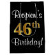 Este na moda, luxuoso e sofisticado design de gingalas de aniversário com tema de aniversário apresenta o número normal "46º", com uma imitação/aparência falsa de ouro, juntamente com uma mensagem de saudação de aniversário e um nome de destinatário personalizável em uma fonte estilo script. Também tem um fundo de cor preta. Uma sofisticada bolsa de presente temático de aniversário como esta pode ser uma maneira divertida de embrulhar um presente ou presente para celebrar o quarenta e sexto aniversário de alguém. [~Z0000513]