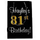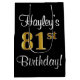 Este design de presente de temas de aniversário, luxuoso e sofisticado, apresenta o número normal "81ruas", com uma aparência grande falsa/imitação em forma de ouro, além de uma mensagem de saudação de aniversário e um nome de destinatário personalizável em uma fonte estilo script. Também tem um fundo de cor preta. Um sofisticado saco-presente temático de aniversário como este pode ser usado quando se dá um presente ou presente em comemoração do aniversário de 81 ruas de alguém. [~Z0000513]