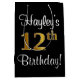 Este luxuoso, na moda, e sofisticado design de presente de aniversário apresenta o número ordinal "12" com um grande visual falsa/imitado inspirado em ouro, além de uma mensagem de saudação de aniversário e um nome de destinatário editável em uma fonte estilo script. Também tem um fundo de cor preta. Um saco de presente temático de na moda de aniversário como este pode ser uma maneira divertida de embrulhar um presente ou presentear alguém que está celebrando seu aniversário de 12. [~Z0000513]