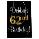 Este design de presente de aniversário sofisticado, luxuoso e na moda apresenta o número ordinal "62. º" com um padrão de gradiente tipo falsa/imitação dourado, juntamente com uma mensagem de saudação de aniversário e um nome de destinatário personalizado em uma fonte estilo script. O fundo é preto colorido. Um saco de presente temático de na moda de aniversário como este pode ser uma maneira divertida de embrulhar um presente ou de apresentar para celebrar o sexagésimo segundo aniversário de alguém. [~Z0000513]