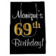 Este sofisticado, na moda, e luxuoso design de saco-presente temático de aniversário apresenta o número ordinal "69" com uma aparência falsa/imitação em ouro, mais uma mensagem de saudação de aniversário e um nome de destinatário personalizado em uma fonte estilo script. O fundo é preto colorido. Um presente de na moda como este pode ser uma maneira divertida de embrulhar um presente de aniversário ou um presente dado a alguém que comemora seu sexagésimo nono aniversário. [~Z0000513]