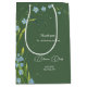 Saco médio de presente chá de panela com um buquê elegante de flores de azul-macio que não me esqueçam, com folhas verdes claras e caules curvos, cores pastel naturais de primavera ou verão, um buquê luminoso romântico de flores silvestres. Aquarela digital botânica. Chá de panela de botânica de flor branca, Saco médio para presentes. Esqueça-Me-Não Coleção.
