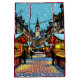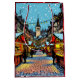 Uma bolsa de presente de Natal com uma representação de desenho animado do mercado de Natal de Estrasburgo, França, representando barracas de compras e pessoas andando em um dia de inverno nevado.