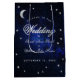 Um design de casamento para um tema de casamento celestial, com a lua e estrela em um fundo azul de noite estrelada. A palavra Casamento e os nomes são escritos em uma fonte caligráfica elegante. A lua e a palavra Casamento são cinza prateado, o resto do texto é branco.