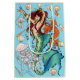 Sereia de cabelos vermelhos vestindo joias de ouro. A sereia tem uma cauda verde, azul e azul. À volta da sereia está um cavalo marinho, peixe gelado, conchas e bolhas de água em pano de fundo azul