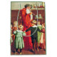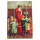 Lovely nostalgic vintage illustration of Papa Noël, or Father Christmas, blowing a horn while cute little children are cheerfully dancing hand in hand in a circle around him.