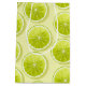 Um padrão de fatias frescas e suculentas de limão em tons brilhantes e vívidos de verde limão, com uma textura aquosa que lhe dá aquele aspecto recém cortado. Eles são colocados sobre um fundo amarelo claro / verde para um visual brilhante e de verão.