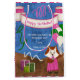 Raposa de menina bonita vestida para festas com um vestido cor-de-rosa com uma prega, segurando um monte de balões rosas, verdes e brancos. Decorado com um grande banner branco com bordas cor-de-rosa mostrando a nota de aniversário feliz personalizável. Também decorado com fitas e caixas de presentes. Em segundo plano, um desenho texturizado simples do céu azul e do chão marrom. A arte original de Suki, todos os direitos reservados.
